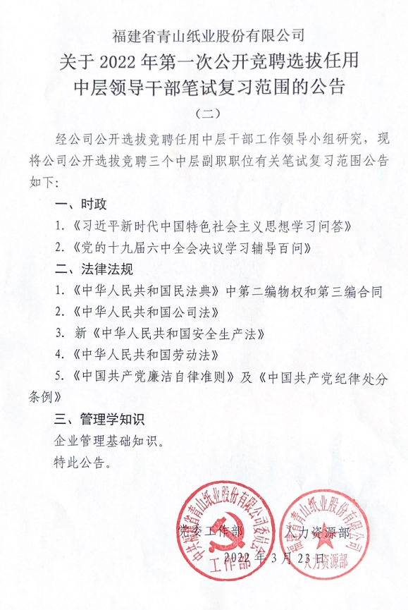 福建省金年會紙業(yè)股份有限公司 關于2022年第一次公競聘選拔任用中層領導干部筆試復習范圍的公告(二)